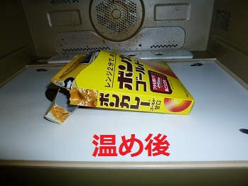 それは、レトルトカレーは通常お湯を沸騰させてから3~5分間温めなければいけませんが、この『ボンカレーゴールド』は、箱のフタを開けて、そのまま箱ごと電子レンジに入れ、2分間でアツアツのカレーが仕上がるのです。(出力500Wの場合)